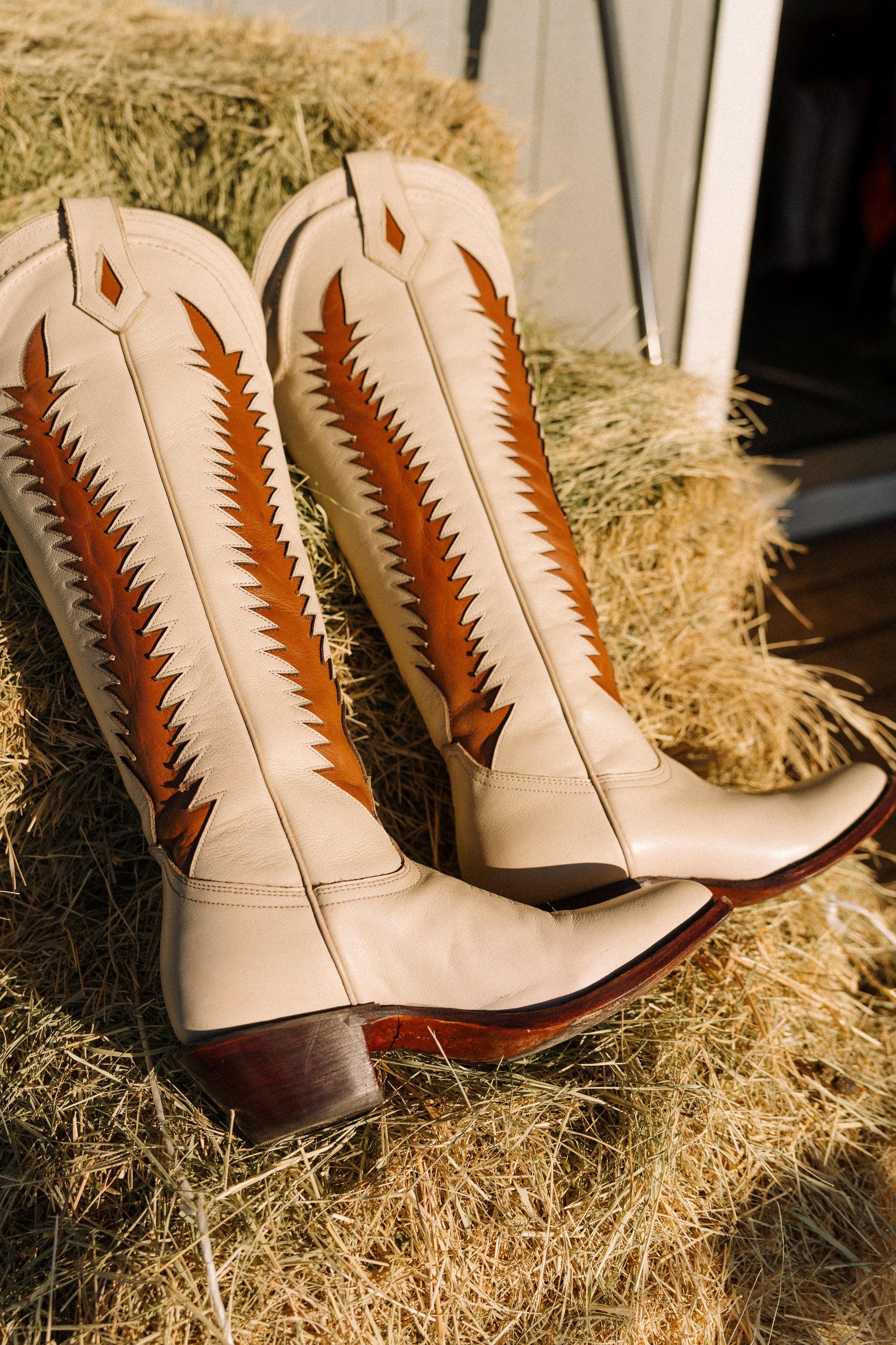 Crafted from full-grain calfskin leather in our gorgeous ivory, this boot features a camel inlay and a bold longhorn design on the back.