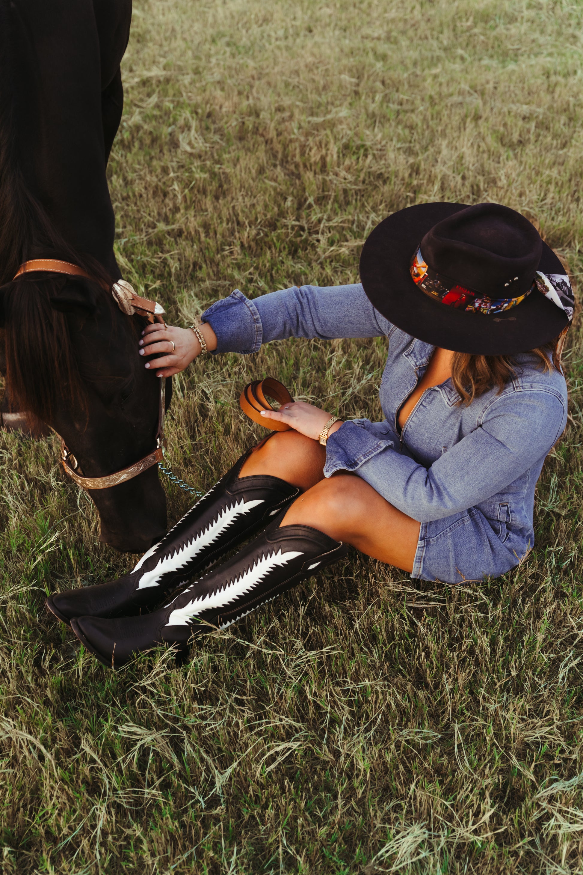 Crafted from full-grain leather in classic black, this boot features a bold white inlay and a striking red lightning bolt on the back.